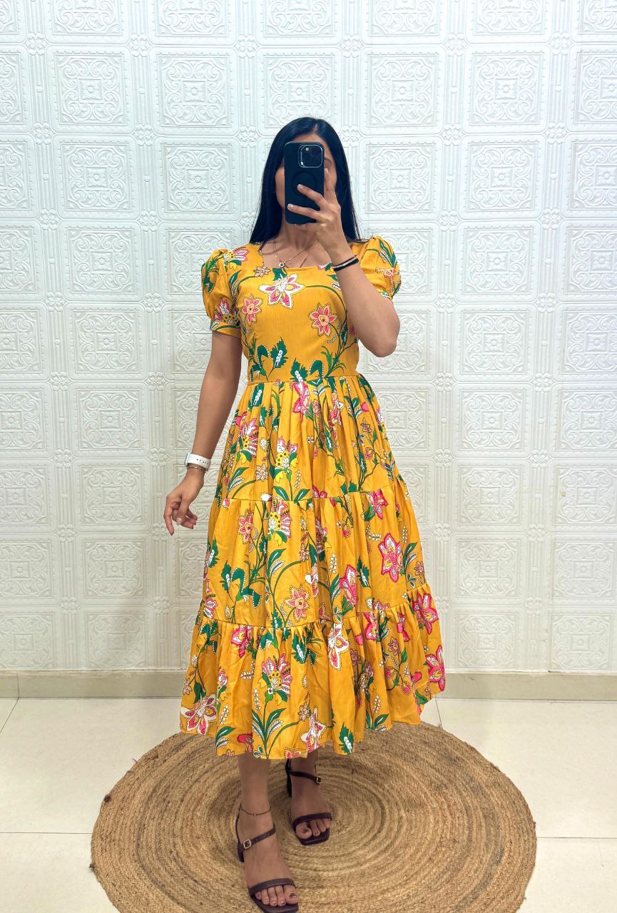 This Dress made from muslin cotton fabric with Print Work and stylish 3 Layer Pattern