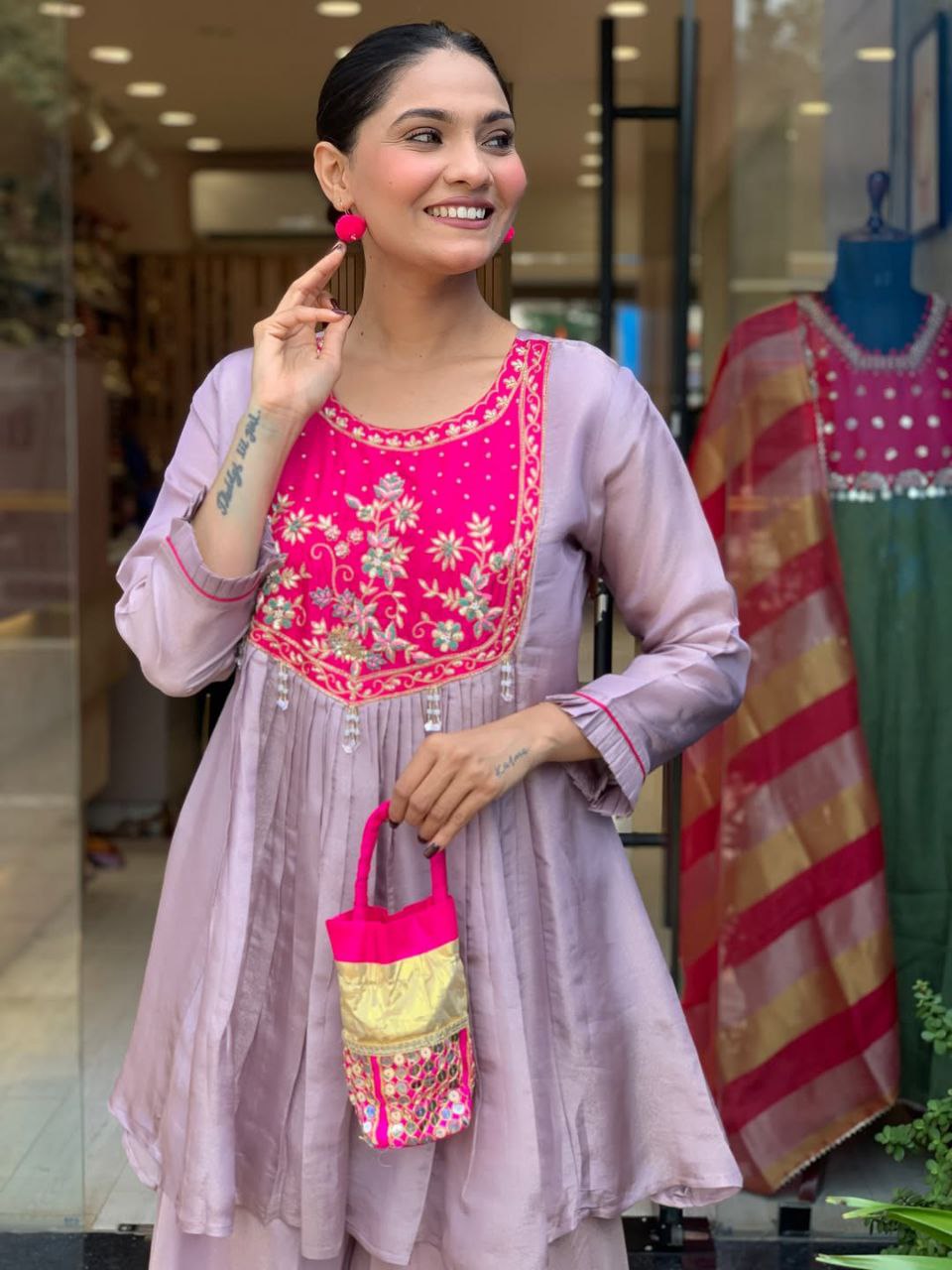 Elevate your ethnic wardrobe with this graceful lavender kurta set, designed with a perfect blend of elegance and comfort. The kurta features a beautifully crafted contrast magenta yoke, adorned with intricate floral embroidery, zari detailing, and delicate pearl tassels that add a rich festive touch.